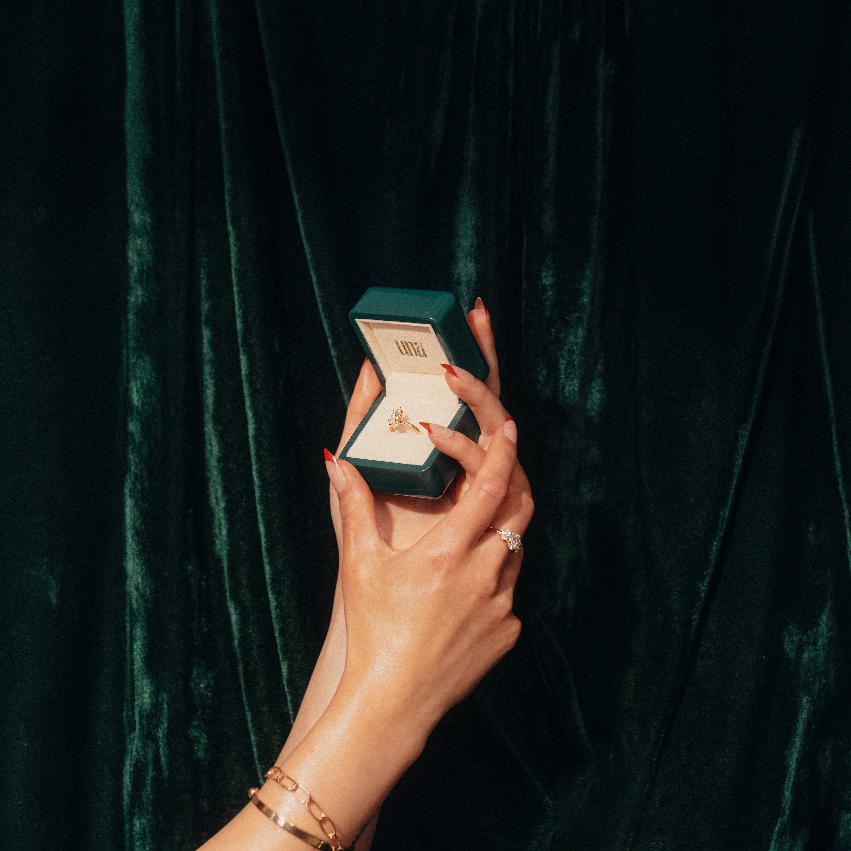 Your ring is made just for you. Once you select your stone size and confirm your design preferences, our skilled artisans begin crafting your one-of-a-kind piece. Please allow 4-6 weeks for production and delivery. Every ring comes beautifully packaged in our custom dark green lacquer Una Diamond box.